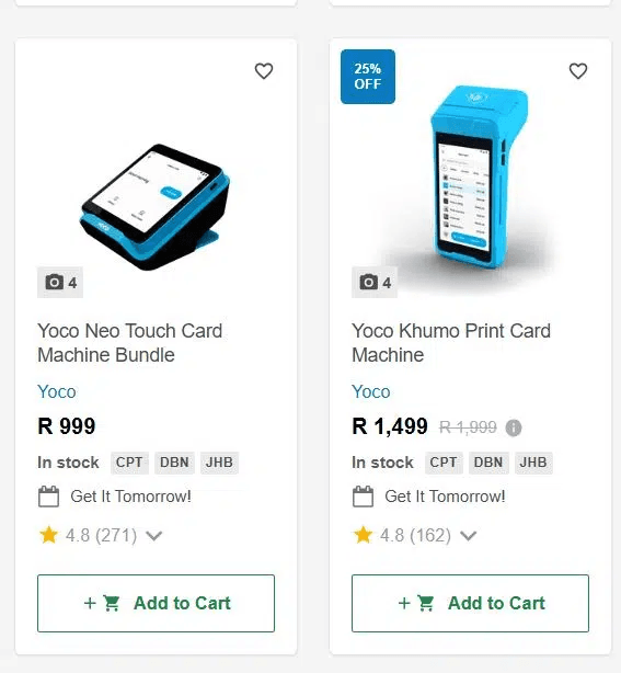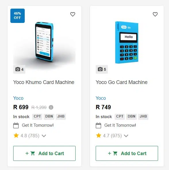 South Africa’s leading online retailer, Takealot, also stocks the full range of Yoco machines. Shopping here gives you the ability to: