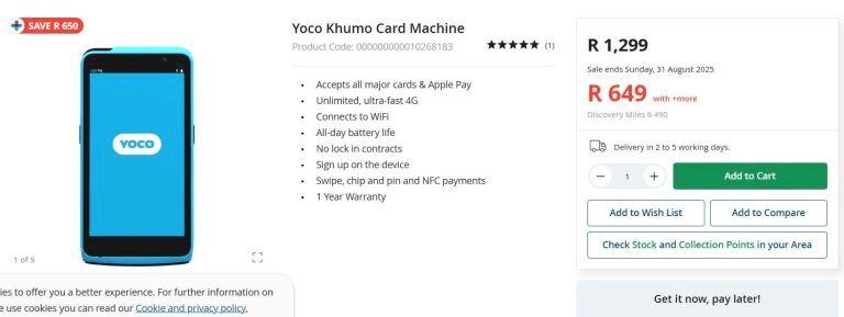 Available at many malls and shopping centres across Gauteng, Incredible Connection often stocks Yoco devices at competitive prices. They sometimes run promotions — for example, the Yoco Khumo has been listed at R649.
