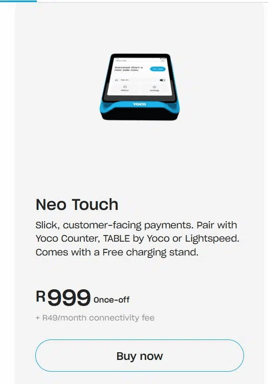 Yoco has a clear and upfront pricing structure. You pay once for the device (no rentals), and a small monthly connectivity fee only when you use it.